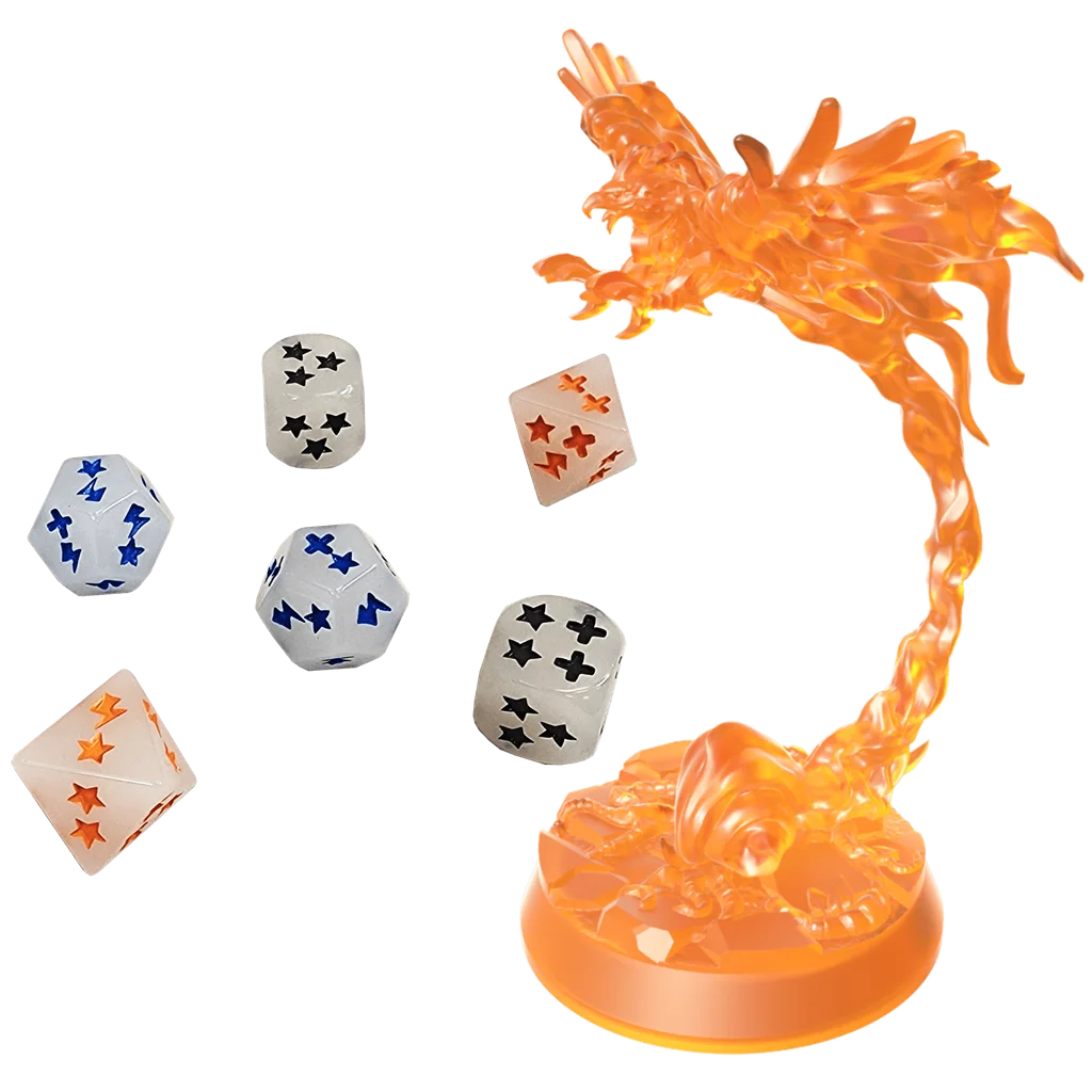 Promo exclusiva compuesta por 12 dados especiales y 1 miniatura translúcida de Indris para Descent: La Guerra del Traidor
